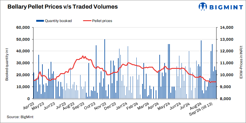 Bellary’s pellet (Fe63%) prices remained stable at INR 9,400/t ($112/t) exw on 13 Sep’24 compared to 10 Sep. Deals of 24,000 t were concluded at INR 9,350-9,400/t ($111-112/t). Buyers purchased quantities on a need basis at current prices as sellers prepare for a maintenance shutdown over the next two weeks. Sponge iron prices fell by INR 300/t ($4/t) w-o-w to INR 25,000/t ($298/t) exw today.