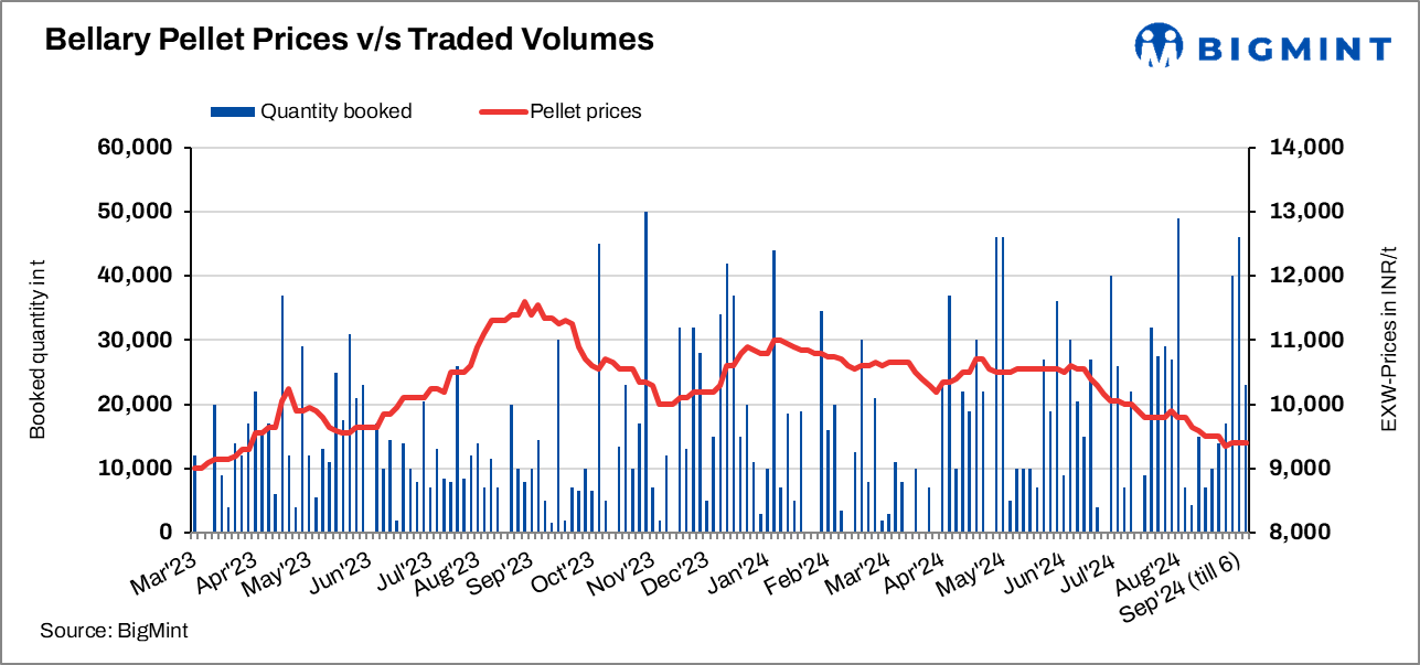Bellary’s pellet (Fe63%) prices remained stable at INR 9,400/t ($112/t) exw on 6 Sep’24 compared to 3 Sep. Deals of around 23,000 t were recorded at INR 9,350-9,550/t ($111-114/t). Steelmakers purchased on need basis at current prices, and pellet offers remained supportive despite a drop in sponge and finished steel prices. Meanwhile, sponge iron (P-DRI) prices decreased by INR 450/t w-o-w to INR 25,300/t exw today.