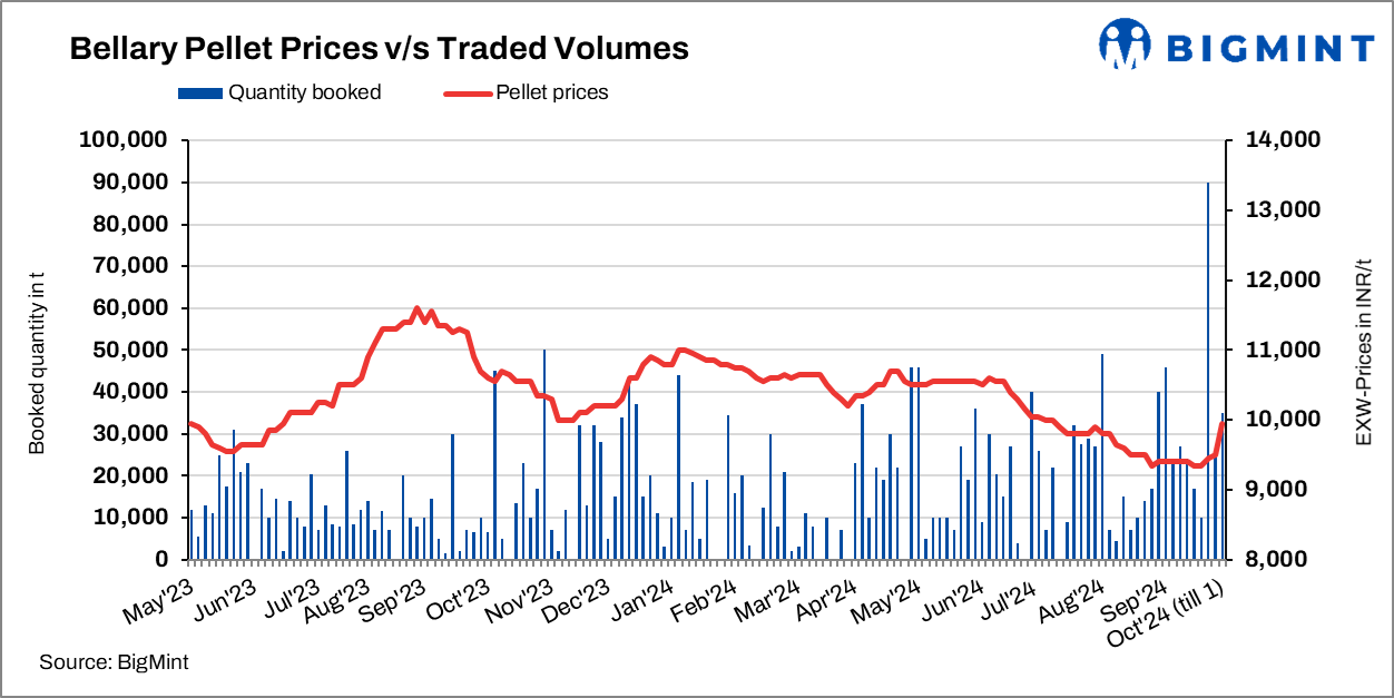 Bellary’s pellet (Fe63%) prices rose by INR 450/t ($5/t) to INR 9,950/t ($119/t) exw on 1 Oct’24 compared to 27 Sep. Deals of 20,000 t concluded at increased offers of INR 10,000/t ($119/t) while 15,000 t deals were also recorded at the earlier offer. The surge in global iron ore, sponge iron, and finished steel prices has supported pellet prices in the region.