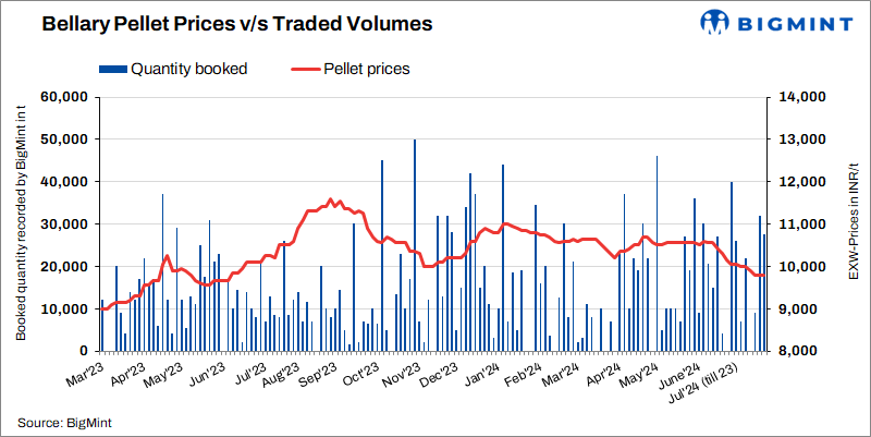 Pellet (Fe63%) prices in Bellary, Karnataka remained stable at INR 9,800/t ($117/t) exw on 23 Jul’24 compared to 19 Jul’24. Around 27,500 t of deals were recorded at INR 9,900/t in this publishing window. Active deals and fallen sponge prices kept supporting pellet prices.