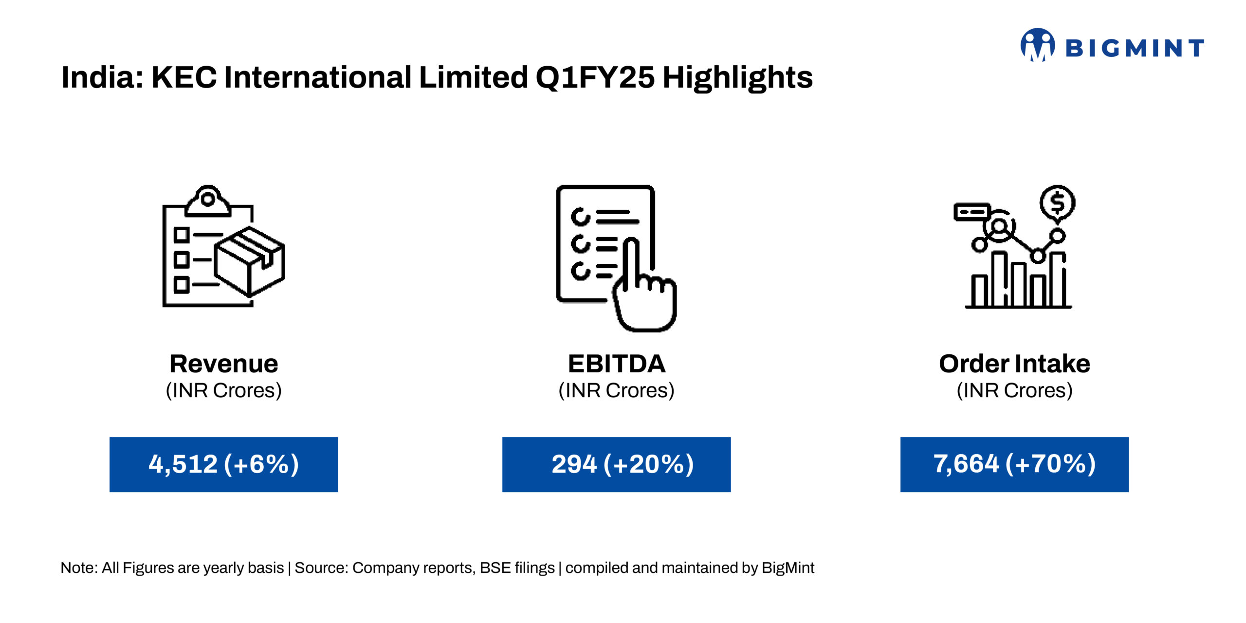 KEC International Limited’s Q1FY’25 revenue rose 6% y-o-y to INR 4,512 crores against INR 4,244 crores in the CPLY. Order intake grew 70% to INR 7,664 crores, driven by T&D, Civil, Renewables, Railways, and Cables. The company has recorded highest ever order book during the quarter and L1 pipeline exceeded INR 42,000 crores. EBITDA increased 20% y-o-y to INR 294 crores against INR 244 crores in Q1FY’24.