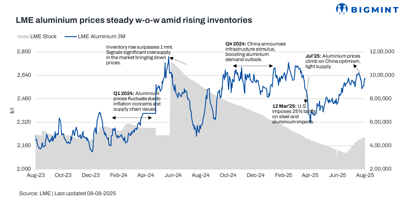 London Metal Exchange (LME) aluminium prices stood range-bound during Week 32 of CY’25 (4-8 Aug 2025).