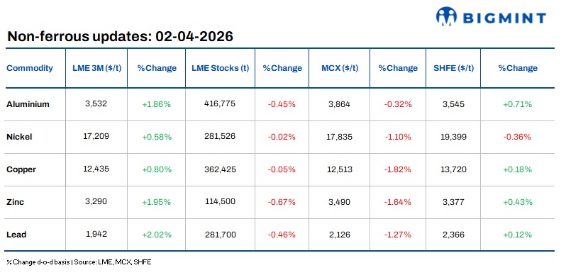 Base metals on the London Metal Exchange (LME) traded higher d-o-d as of close on 01 April 2026, indicating broad-based strength across most metals. Aluminium rose 1.86% to $3,532/t, while zinc gained 1.95% to $3,290/t, and copper increased 0.80% to $12,435/t. Nickel also edged up 0.58% to $17,209/t, whereas lead posted the strongest gain, rising 2.02% to $1,942/t.