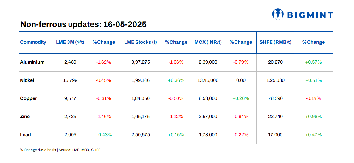 Base metals prices on the London Metal Exchange (LME) showed a slight declining d-o-d, with aluminuim decreasing by 1.62% to $2,489/tonne (t). Meanwhile, inventories at LME-registered warehouses showed mixed trends d-o-d, with zinc down by 1.12%.