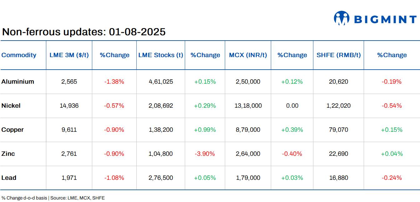 Copper futures on MCX fell 4% to a record low of INR 861.70/kg after the US announced a 50% tariff on copper imports, excluding refined copper. The surprise move triggered a sharp sell-off, with US futures plunging 22% and LME prices down 1%.