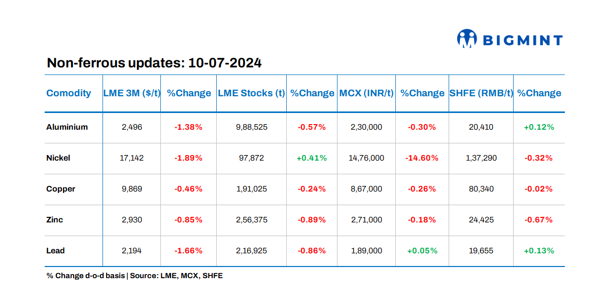 Base metals prices on the LME edged downward, with nickel witnessing the steepest decline of 1.89%. Similarly, metal stocks at LME-registered warehouses showed a negative trend, except for nickel.