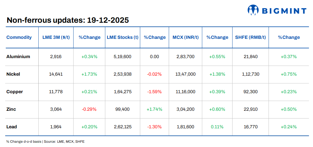 Base metals prices on the London Metal Exchange largely moved higher on 19 December, led by strong gains in nickel. Nickel surged 1.73% d-o-d to $14,641/tonne (t), while aluminium rose 0.34% to $2,916/t. Copper edged up 0.21% to $11,778/t, and lead gained 0.20% to $1,964/t. However, zinc prices slipped 0.29% to $3,064/t.