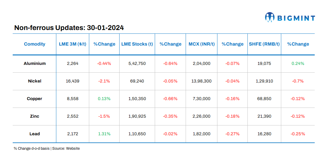 The closing prices of base metals on the London Metal Exchange (LME) exhibited diverse patterns on Monday, 29 January, 2024. Nickel experienced the most significant decline, dropping by 2%. Meanwhile, there was a decrease in stocks held in LME-registered warehouses.