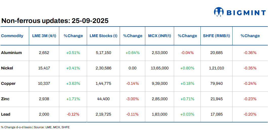 Base metals prices on the London Metal Exchange (LME) saw positive trends d-o-d, with copper increasing by 3.63% to $10,337/tonne (t). Meanwhile, inventories at LME-registered warehouses registered negative movements d-o-d, with zinc recording the highest decline of 2.24%.