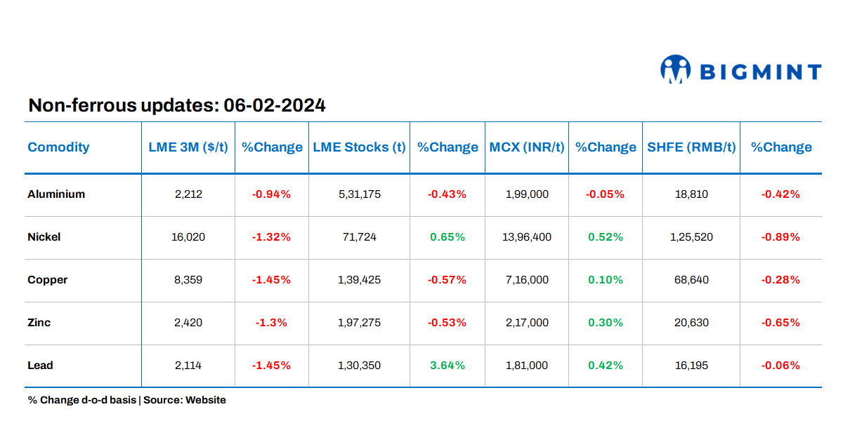 Three-month aluminium futures fell by 0.9% to $2,212/tonne (t), nickel prices was at $16,020/t (down 1.3%), copper prices settled at $8,359/t (down 1.4%), zinc edged down by 1.3% to $2,420/t and lead dropped by 1.4% to $2,114/t.