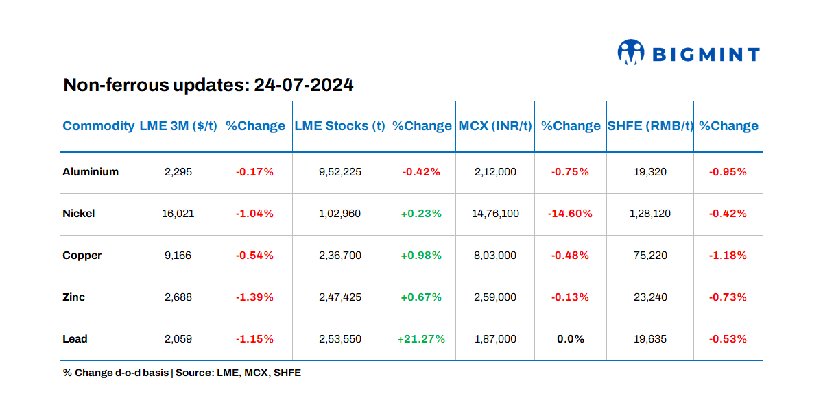 Base metals prices on the London Metal Exchange (LME) showed a downtrend with zinc witnessing the largest decrease of 1.39%. Similarly, metal stocks at LME-registered warehouses showed a positive trend except aluminium with the significant inflow seen in lead which rose by 21.27%.