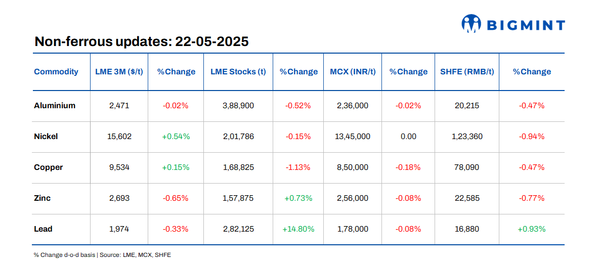 Base metals prices on the London Metal Exchange (LME) remained range-bound d-o-d, with nickel increasing by 0.54% to $15,602/t. Meanwhile, inventories at LME-registered warehouses showed mixed movements, with lead stocks increasing by 14%. Additionally, BigMint assessed domestic copper armature scrap at INR 790,000/t ex-Delhi. Aluminium Tense scrap prices remained steady d-o-d, with ex-Delhi at INR 196,000/t and ex-Chennai at INR 197,000/t.