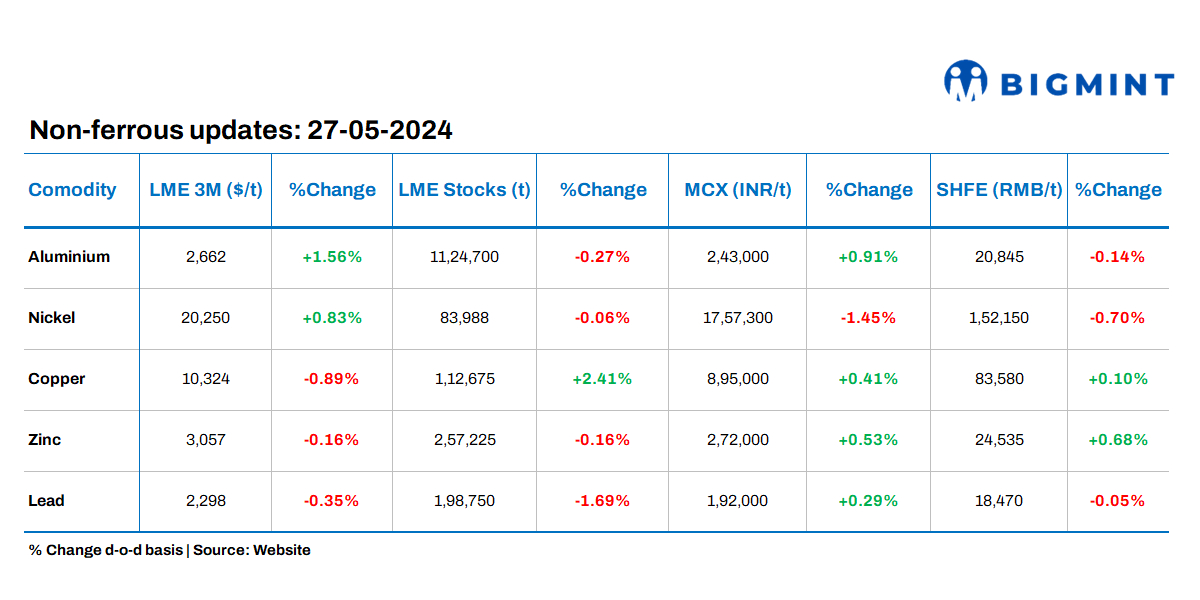 - Base metals prices on LME witnessed mixed trends as of the last closing. The highest gain was seen in aluminium – 1.5%. Meanwhile, stocks witnessed outflows barring copper.