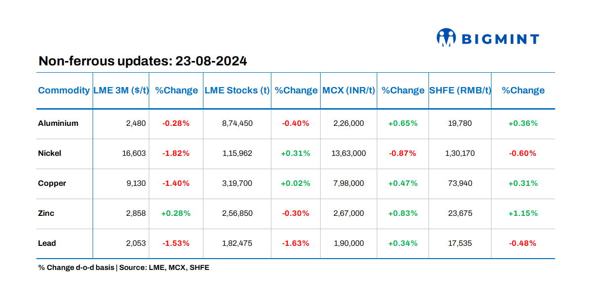 Base metals prices on the London Metal Exchange (LME) showed negative trends except zinc. Notably, nickel saw the largest decrease of 1.82%. Meanwhile, metal stocks at LME-registered warehouse showed a mixed movement, with largest outflow witnessed in lead by 1.63%.