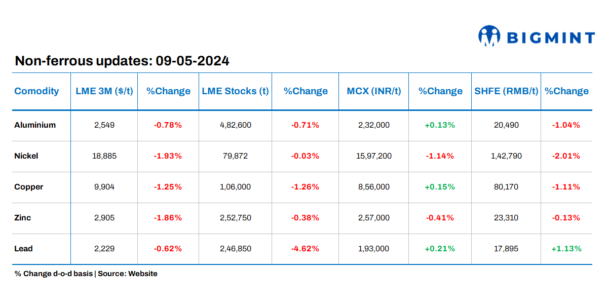 Base metals prices on the London Metal Exchange (LME) witnessed downtrend with the highest change seen in nickel prices. Meanwhile, the stocks at the LME registered warehouses saw outflows with the largest drop seen in lead.