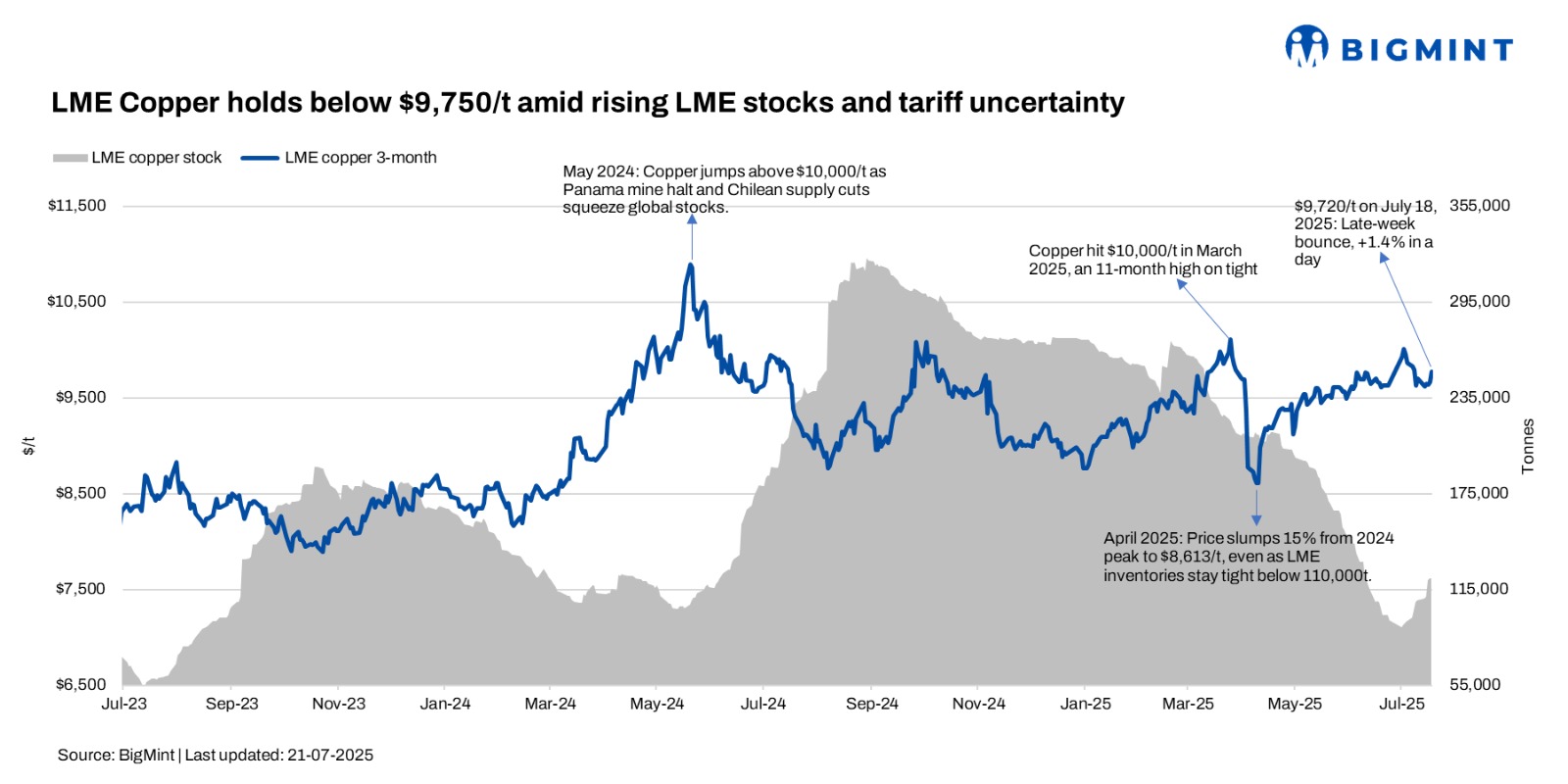 Market sentiment remains cautious, partly due to the impending US copper import tariffs expected in early August. The tariff has disrupted trade flows, with buyers alternating between stockpiling and holding back. This uncertainty, coupled with weak industrial signals from China and other macroeconomic headwinds, has led many market participants to adopt a defensive stance. Additionally, profit-taking and reduced fund positioning have contributed to the softer tone.