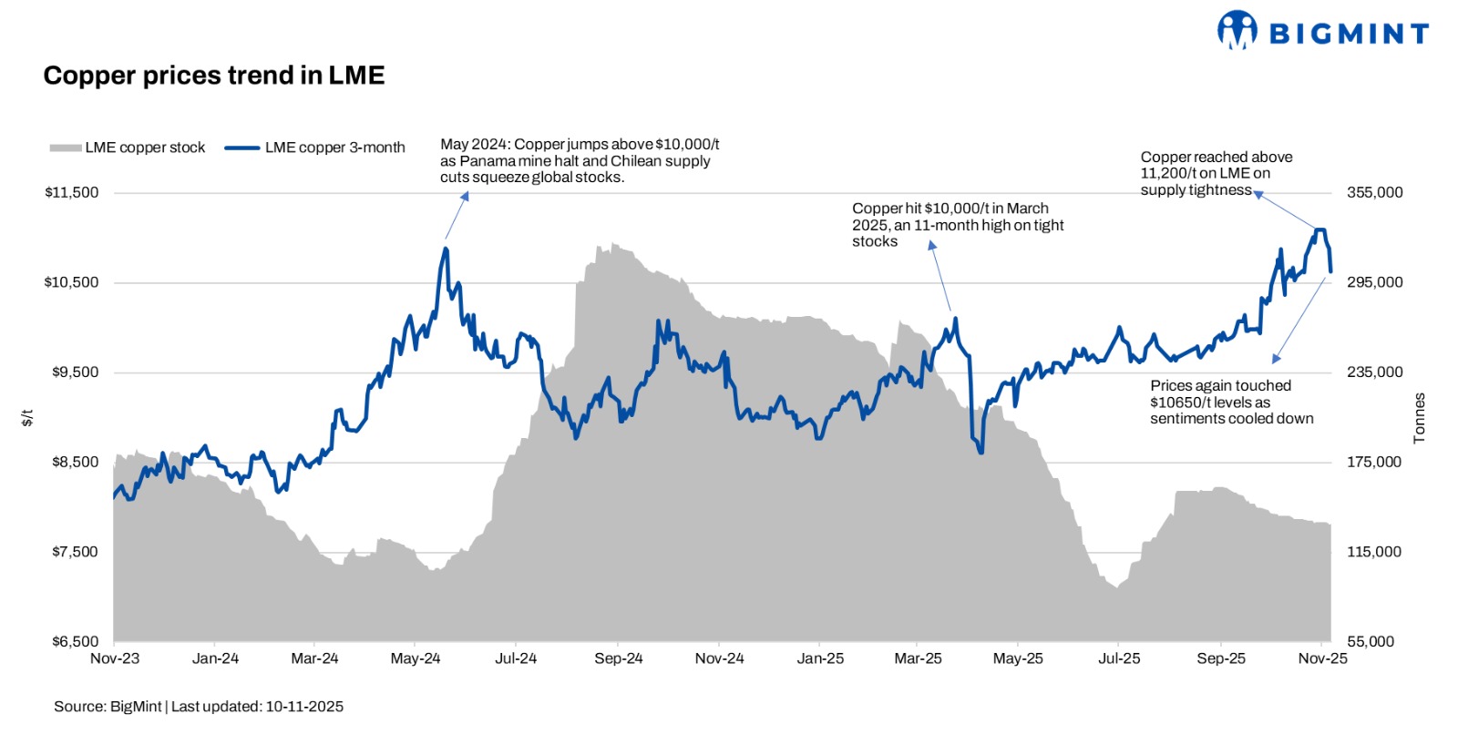 Global copper prices have softened this week, slipping from around $10,920/tonne (t) on the London Metal Exchange (LME) to nearly $10,720/t, as the market saw a round of profit-booking, a firmer US dollar, and softer spot demand from China. After a strong rally driven by mine disruptions and tightening inventories, traders are now reassessing whether the recent surge was overstretched in the near term.