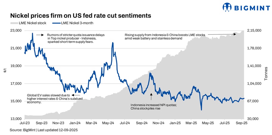 Nickel futures on the London Metal Exchange (LME) closed at $15,345/t on 12 September, marginally higher than last week’s $15,280/t. LME warehouse inventories rose 4% w-o-w to 225,084 t against 215,418 t. Prices started weaker but recovered mid-week, supported by optimism over a potential US Fed rate cut, supply concerns in Indonesia, and favourable macroeconomic signals, offsetting persistent supply-side pressure.