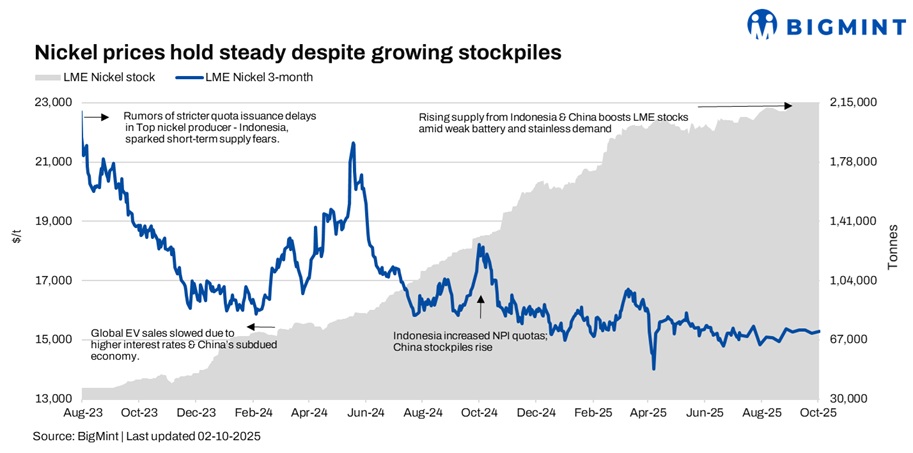 In Q3CY’25, nickel prices hit five-year lows due to persistent LME oversupply, despite robust demand for nickel sulphate and mixed hydroxide precipitate (MHP) in China. China’s strategic restocking efforts helped support demand for chemical intermediates, contrasting with weak buying from the stainless steel and battery sectors. Indonesian production growth added to oversupply pressures, keeping prices subdued. The market reflects a complex balance between short-term oversupply and confidence in long-term demand fundamentals, driven by EV battery growth and supply disruptions.