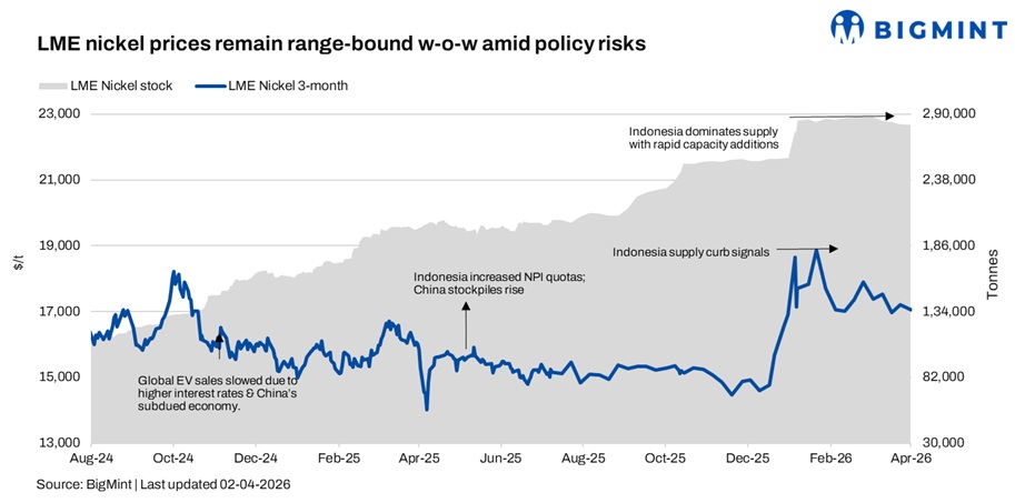 Nickel prices on the London Metal Exchange (LME) remained range-bound in the week ended 02 April, with the three-month contract closing at $17,060/t, range-bound from $17,210/t in the previous week. LME inventories remained largely stable at 281,496 t compared with 281,574 t in the previous week, indicating balanced market conditions.