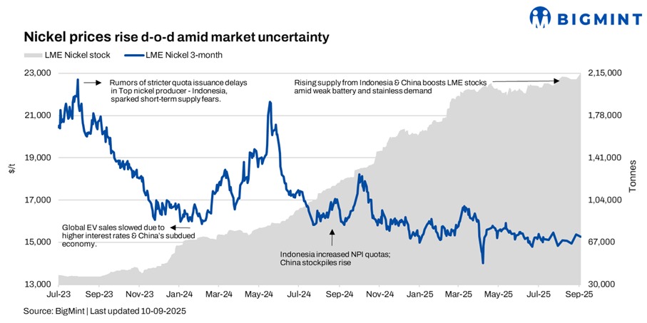LME nickel futures rose $41/t d-o-d to $15,146/t, while spot prices increased $46.5/t to $14,963/t. LME warehouse inventories rose 3,000 t to 221,094 t on 10 Sep’25. Nickel prices gained after a 0.1% m-o-m drop in the US Producer Price Index (PPI) boosted hopes for a Fed rate cut, but rising pure nickel inventories capped gains. The market is expected to remain volatile in the near term.