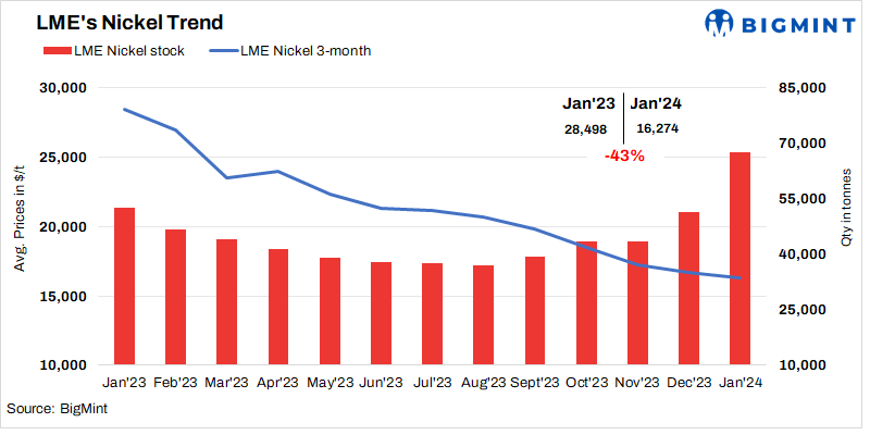 Nickel prices on the London Metal Exchange (LME) have recorded a significant 43% y-o-y decline, falling to $16,274/tonne (t) in January 2024 from $28,498/t in January 2023. This drop is attributed to an increased supply of nickel from Indonesia coupled with sluggish demand.