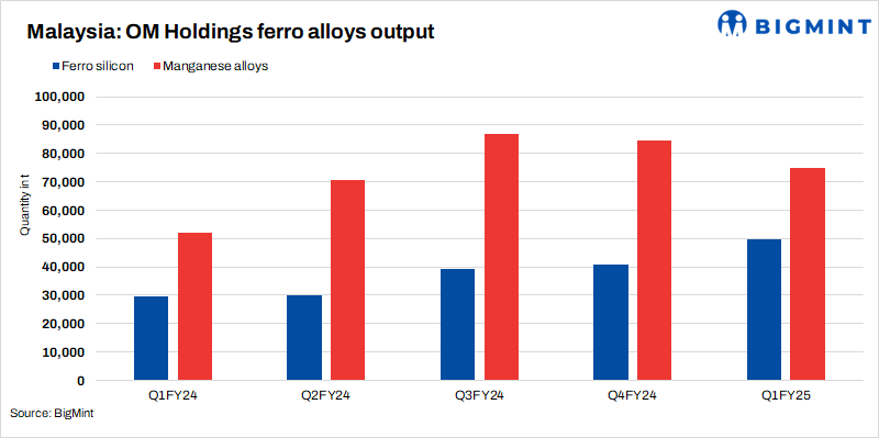 - OM Holdings, Sarawak, a Malaysia-based ferro alloys manufacturer, recorded manganese alloys output at 75,056 t in Q1CY’24, down -11% q-o-q.