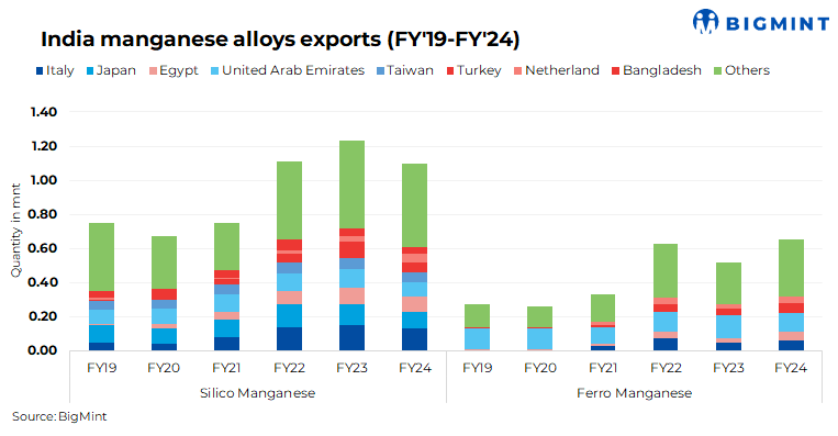 India’s total manganese alloy exports in FY’24 amounted to 1.7 mnt, as per data maintained with BigMint. Exports account for nearly 40% share of India’s manganese alloys production, which was recorded at around 4 mnt in FY’24.