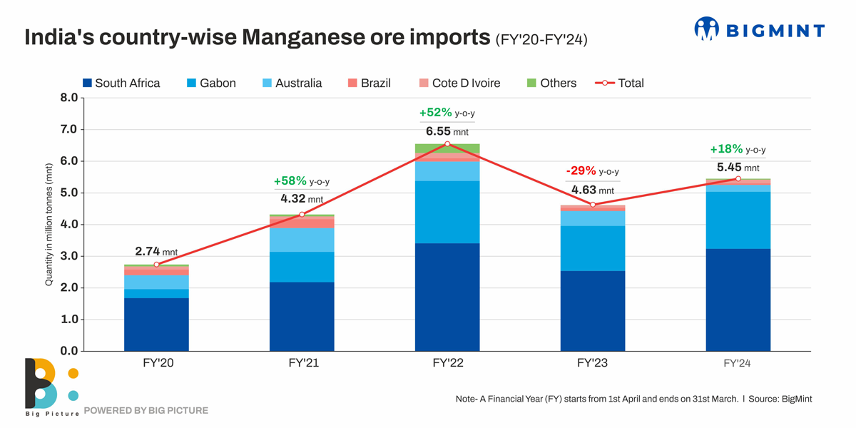 Manganese ore imports grew by 18% y-o-y to 5.45 mnt in FY’24. This is because of attractive prices below $5/dmtu (dry metric tonne per unit) and smelters booked aggressively thereby supporting domestic silico manganese production. It deserves mention that manganese alloys producers, especially exporters, have higher demand for imported material. Y-o-y, exports of manganese alloys, too, reveal a marginal uptick. Moreover, quality benefits drive manganese ore imports. For example, due to its higher yield compared to domestic material, high-grade Gabonese ore (44% Mn) remains attractively priced, incentivising a shift towards imports for yield optimisation. Imported manganese ore contains around 4% Fe, providing better yield compared to domestic ore, which typically contains up to 2% Fe.