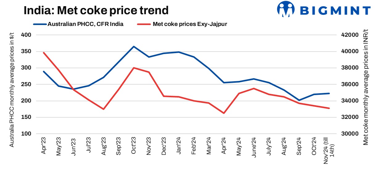 Third round of price cut awaited for Chinese coke: Chinese steel mills in Tangshan have implemented the second consecutive cut in met coke procurement prices, of RMB 50-55/t ($7-7.5/t), effective 11th Nov’2024. Reduced hot metal output brought down bids for met coke. Prices in Hebei’s Tangshan stood at RMB 1,760/t. Discussions about a potential third round of coke price cuts in China surfaced on November 13, with expectations that mills would implement the reductions starting November 14, aiming to finalize them by the end of the week.
