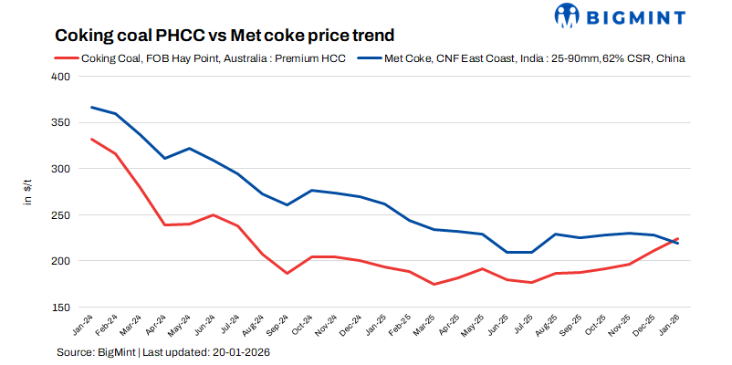 Metallurgical coal and coke markets entered a consolidation phase in mid-January after a sharp early-month rally, with prices stabilising at elevated levels as Australian weather disruptions continued to constrain supply. While downstream steel demand signals remain mixed, limited spot availability and logistical risks are preventing any meaningful downside correction.
