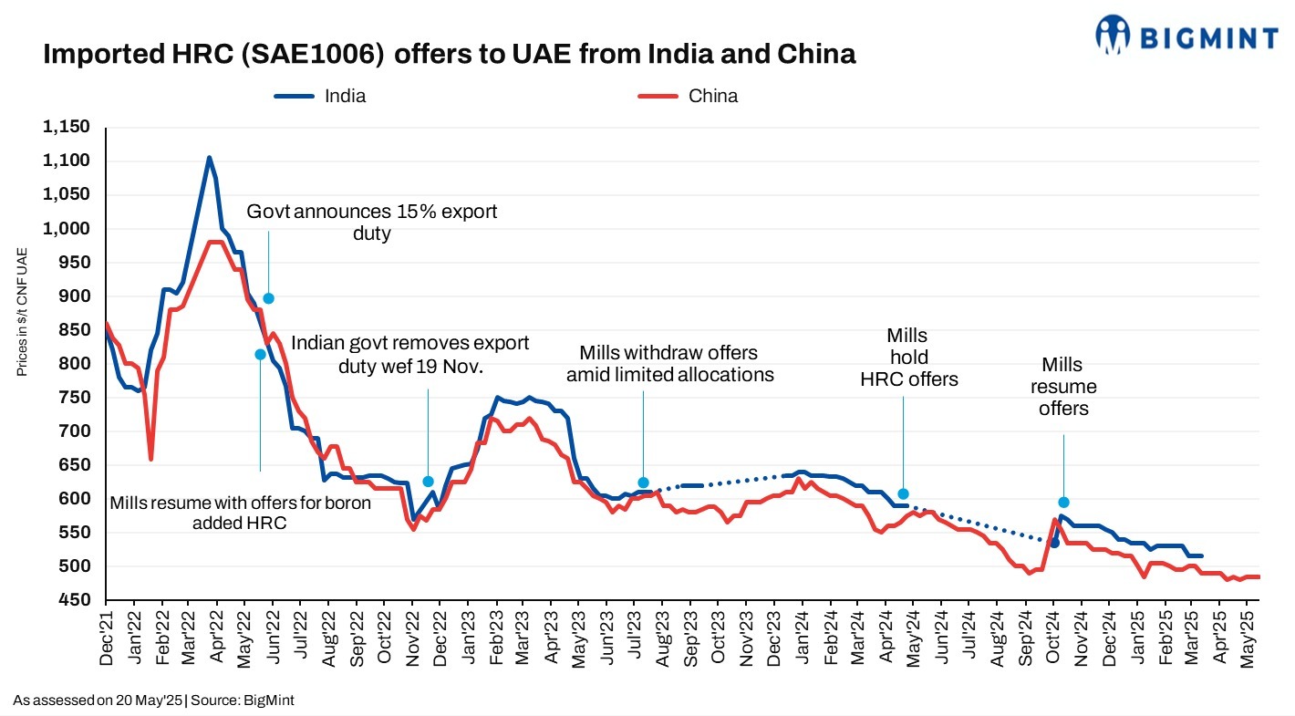 Middle Eastern importers have booked around 40,000-45,000 tonnes (t) of hot-rolled coil (HRC) from Japan at $500-505/t CFR for end-July 2025 shipment. Chinese HRC offers stayed rangebound. On the other hand, Indian mills held to their offers to the Middle East, driven by competitive pricing and stronger domestic demand.