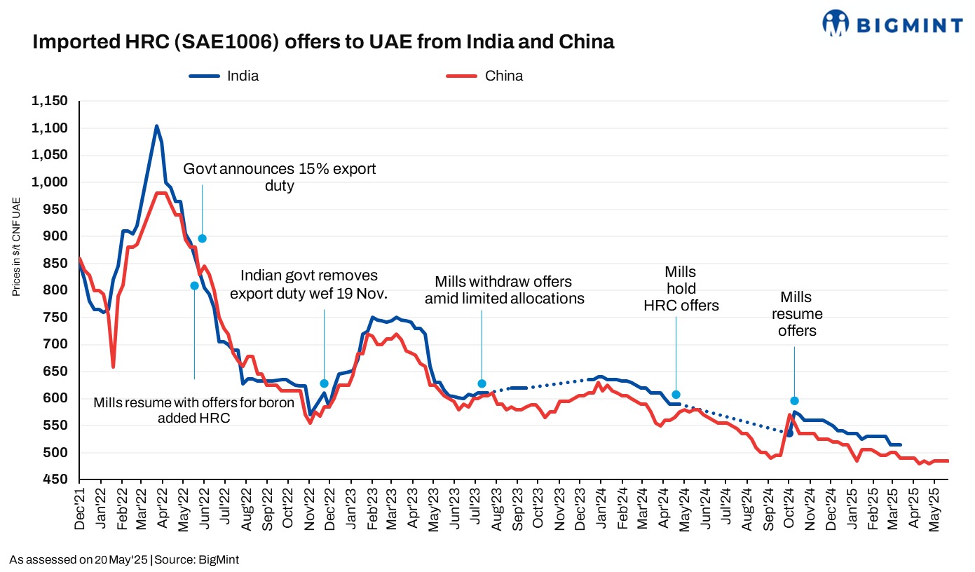 China’s HRC (S235 and S275) export offers to Middle East remained range-bound at $480-485/t CFR UAE. Notably, a tube maker finalised a deal of 30,000-35,000 t at $477/t CFR UAE for Jul’25 shipments. However, a source indicated, “demand remains stable ahead of Eid al-Adha in ME.” This competitive Chinese pricing has led Indian mills to largely refrain from making active offers.