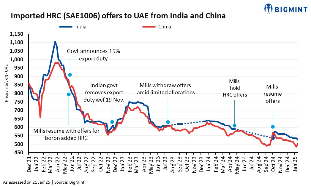 Imported hot-rolled coil (HRC) offers showed mixed trends w-o-w in the Middle East. HRC export offers from India to the Middle East dropped by $10/tonne (t) to $520-525/t CFR UAE from $530-535/t a week ago, as per BigMint’s sources. Prices fell following a deal for around 15,000 tonnes (t), which was heard to have concluded at around $520-525/t CFR UAE.