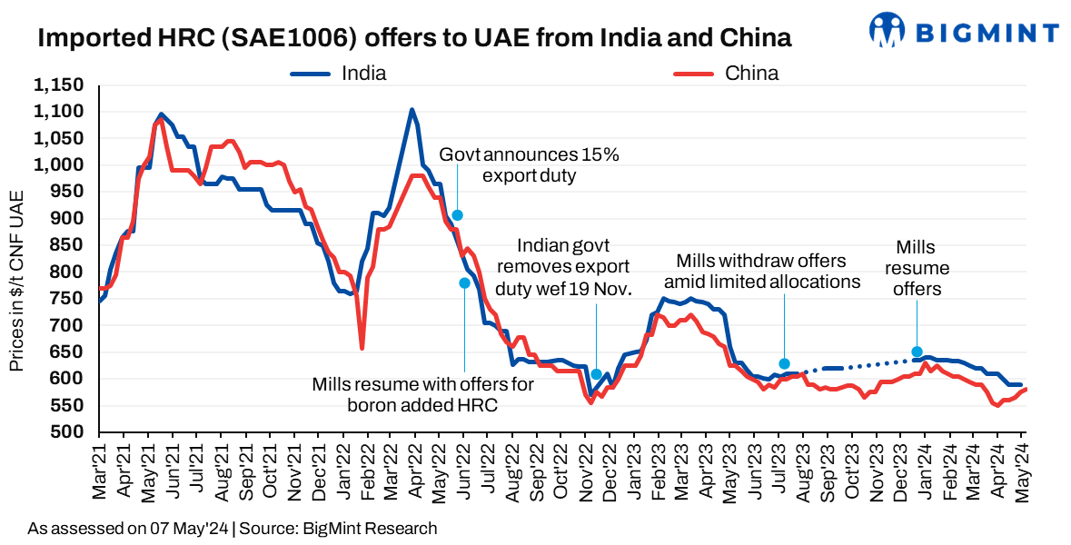 Indian mills have continued to hold HRC export offers due to limited export allocations and higher domestic realisation. However, market participants expect “Indian mills may resume HRC export offers towards the end of this week for June-July 2024 shipments”.