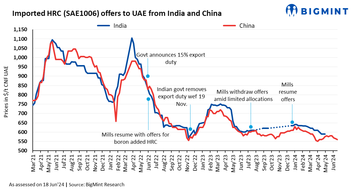 No fresh offers were heard from Japan. The last heard HRC offers from Japan to ME were at $570-575/t CFR UAE on 11 June 2024.