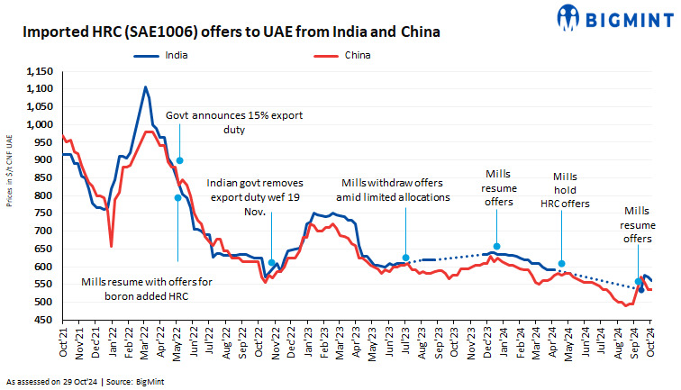 Imported HRC offers from China to the Middle East (ME) remained range-bound w-o-w at $530-535/t CFR UAE, amid volatile SHFE futures. However, a deal of around 20,000-25,000 tonnes (t) was heard concluded at $525/t CFR UAE for late November-early December 2024 shipment.