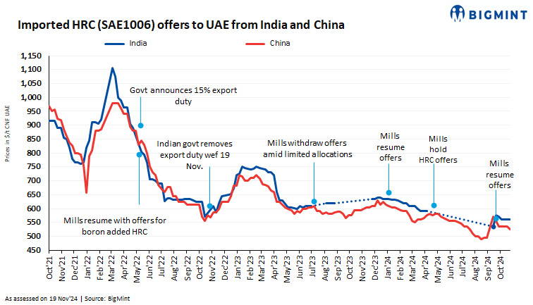 Imported hot-rolled coil (HRC) offers from China to the Middle East (ME) dropped by around $10/tonne (t) w-o-w to $520-525/t CFR against $530-535/t CFR UAE a week ago. Prices fell amid a recent deal of around 60,000 t, which was heard to have concluded at around $520-525/t CFR for late-December 2024 shipment.