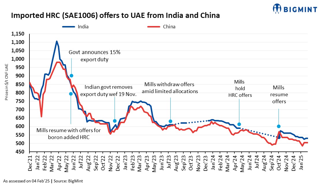 The Middle East’s hot-rolled coil (HRC) market saw mixed price trends this week, with Indian HRC offers holding steady w-o-w at $530/t CFR UAE. This stability was seen after a recent deal of 5,000-6,000 tonnes (t) concluded at similar price levels, informed a source.