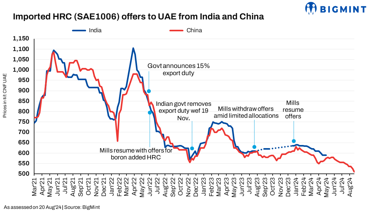 China’s HRC (grades S235 and S275) export offers to the Middle East (ME) declined by around $15-20/t w-o-w to $510-515/t CFR UAE against $525-535/t CFR UAE amid declining SHFE HRC futures. Moreover, a deal of around 26,000 t has been heard concluded at similar levels for Sept’24 shipments. Additionally, no firm offers were heard from Japan, India and South Korea.