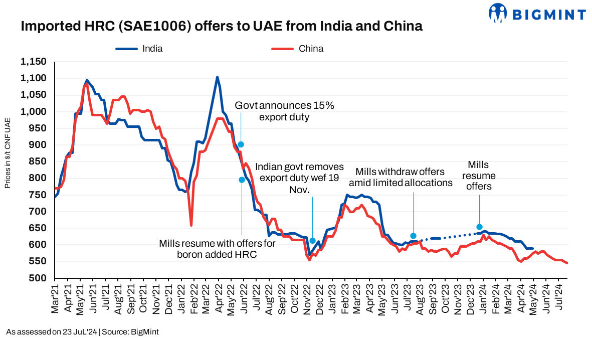 China’s HRC export offers to the Middle East fell by $5/t w-o-w to $545-550/t CFR UAE for Sep’24 shipment against $550-555/t CFR UAE a week ago. Prices dropped amid a sharp fall in futures. A deal of 3,000 t was concluded at $540/t CFR UAE for late-Aug shipment. Imported HRC offers from Japan remained stable this week at $555/t CFR UAE.