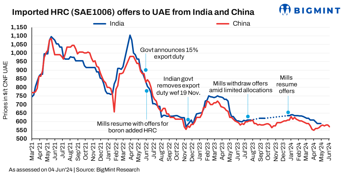 Chinese HRC export offers to the Middle East fell by $5-10/t w-o-w to $570-575/t against $580-585/t. However, no deals was heard concluded amid sluggish demand and decline in SHFE futures. SHFE HRC futures fell by RMB 92/t ($13/t) w-o-w to RMB 3,795/t ($524/t) against RMB 3,887/t ($537/t) in the previous week.