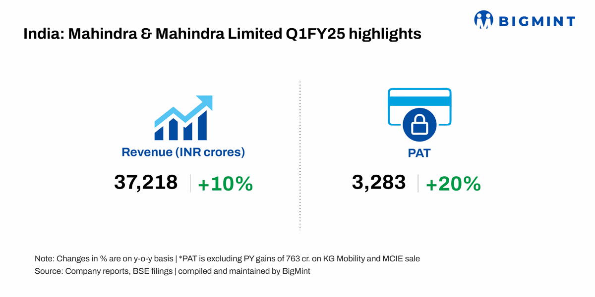 Mahindra & Mahindra Limited (M&M) has reported a rise of 10% in revenue on the year to INR 37,218 crore in Q1FY’25 against INR 33,892 crore in Q1FY’24. In the auto business, the company achieved highest ever Q1 volumes of 212,000 (up 14% y-o-y). Also, in the farm business, highest ever quarterly volumes of 120,000 (up 5% y-o-y) was achieved during the quarter.