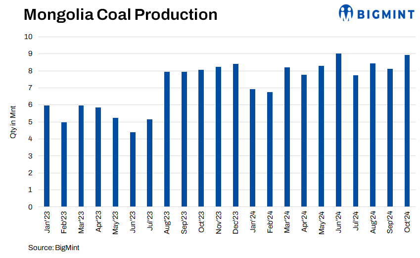 Mysteel Global: Total coal production in Mongolia during October 2024 rose 10.9% m-o-m to 8.94 million tonnes (mnt), according to new data released by the National Statistical Office of Mongolia (NSO). The output was also higher by the same 10.9% compared with October last year.