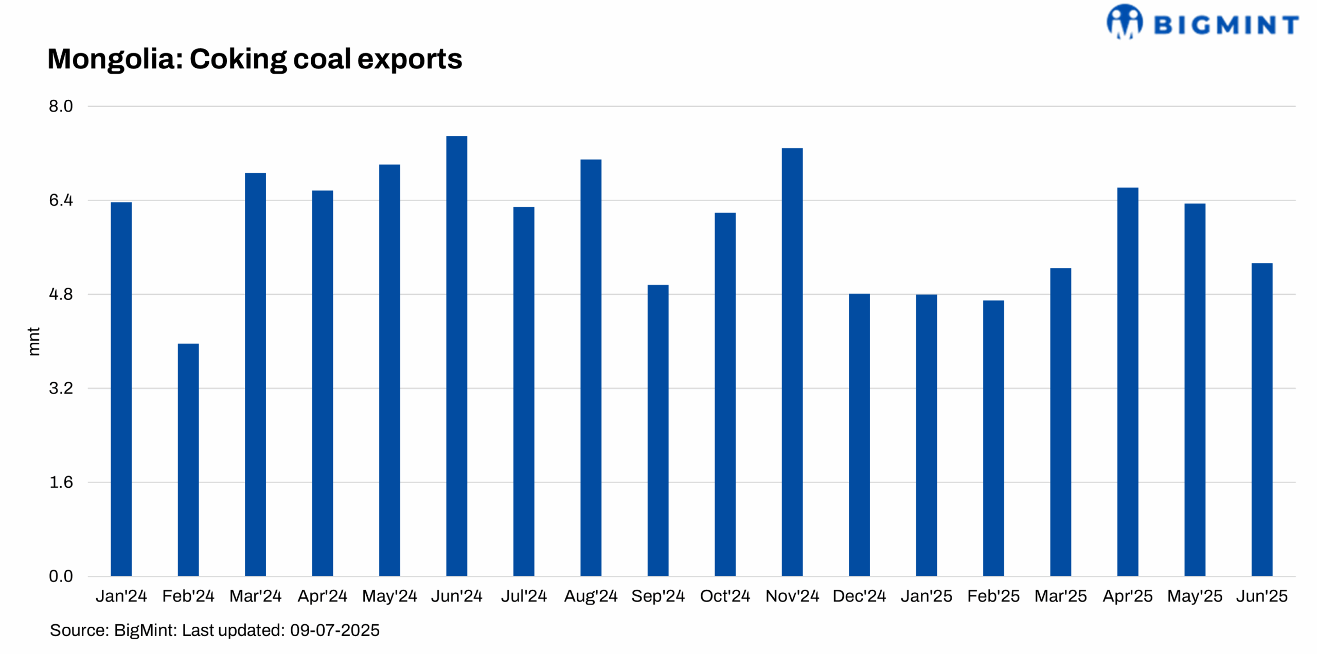 Mongolia’s coking coal exports declined by 28.9% y-o-y in Jun’25 to 5.32 million tonnes (mnt), compared to 7.5 mnt in Jun’24. On a m-o-m basis, exports were down 16.06% from 6.35 mnt in May 2025. Cumulatively, exports in H1 CY2025 (January-June) stood at 33.04 mnt, marking a 13.67% decrease from 38.27 mnt recorded in the same period of CY2024.