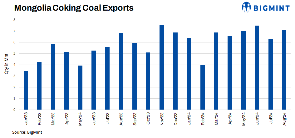 Mongolia’s coking coal exports rose by 28% y-o-y to 51.67 mnt in Jan-Aug’24, up from 40.38 mnt in Jan-Aug’23. Exports increased by 13% to 7.10 mnt m-o-m in Aug’24 compared with 6.29 mnt in Jul’24. Mongolia’s total coal exports increased by 31.33% y-o-y in Jan-Aug’24 compared to Jan-Aug’23.
