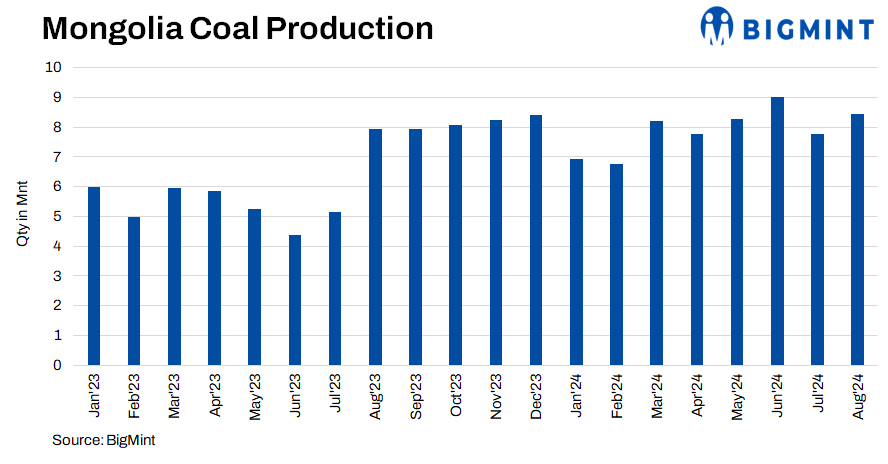 SXCoal: The Mongolian Mining Corporation (MMC) produced 4.30 million tonnes (mnt) of raw coal in July-September 2024 (Q3CY’24), a 23% increase from the same period last year but a 10% drop from the previous quarter. The company processed 3.66 mnt of raw coking coal, down 6% y-o-y and 10% q-o-q. Washed coking coal production was 1.93 mnt, slightly down by 0.1% y-o-y and 13% q-o-q, while sales increased by 16% y-o-y but decreased 12% from the last quarter.