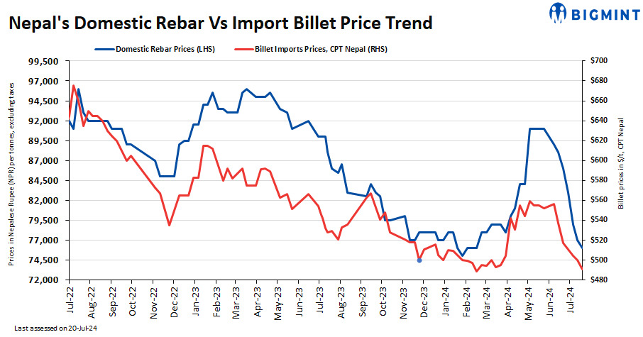 Nepalese rebar offers for cash and bank guarantee dipped by NPR 1,000/t ($7/t) w-o-w to NPR 76,000-77,000 ($567-574/t) and 78,000-80,000/t ($582-597/t), this decline is attributed to low demand amid extreme weather conditions. However, no deals have been heard concluded. BF-route wire rod coil (WRC) offers stood at $570/t exw. EAF/IF WRC offers remained range-bound for the week at $515/t exw Durgapur.