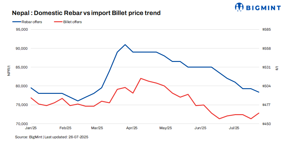 Nepal’s rebar offers dropped by NPR 900/t ($6/t) w-o-w to NPR 78,000-79,000/t ($563-570/t) for cash guarantee sales and NPR 80,000-82,000/t ($578-592/t) for bank guarantee ones. Prices dropped amid sluggish domestic demand in the retail market. Wire rod offers dipped by $7/t w-o-w to around $498/t CNF Raxaul, Nepal, for IF-EAF-route products.