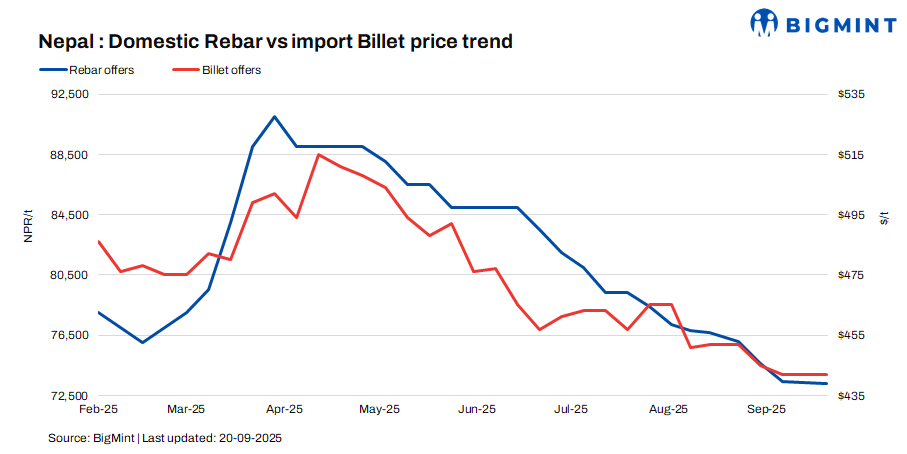 Nepal rebar prices declined by NPR 100/t ($1/t) w-o-w to NPR 72,500-74,500/t ($513-527/t) for cash guarantee sales and NPR 74,500-76,500/t ($527-541/t) for bank guarantee ones. The drop was attributed to weak demand due to the monsoon and the festive season, along with disruptions caused by the recent protests in Nepal. Wire rod (IF-EAF) offers were also heard lower, at $480/t CNF Raxaul.